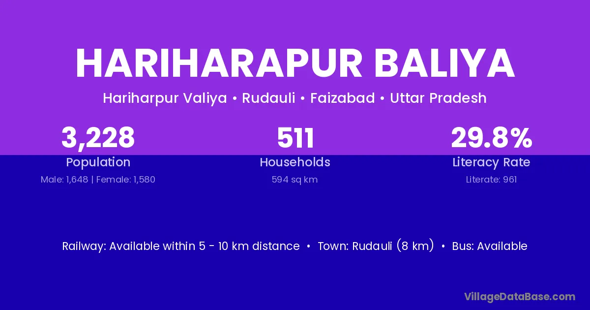 Rudauli (8 km) is the nearest town to Hariharapur Baliya village for major economic activities and is located approximately 8 km away.