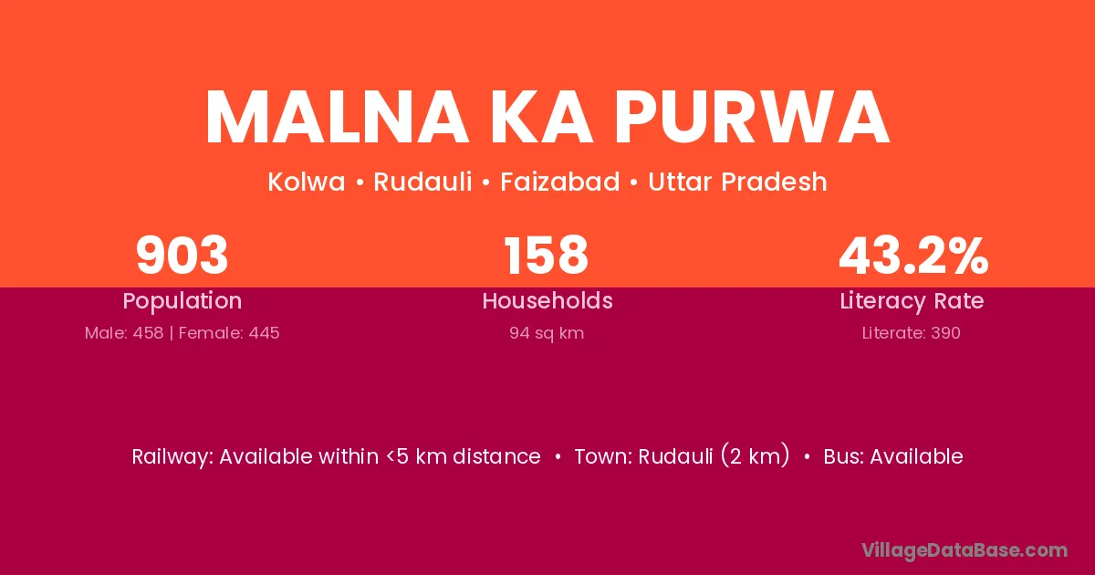 Malna Ka Purwa village has a total population of 903 people, of which 458 are males and 445 are females.