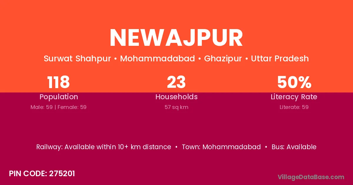 The literacy rate of Newajpur village is 67.90%. Male literacy stands at 78.52% and female literacy at 56.09%.