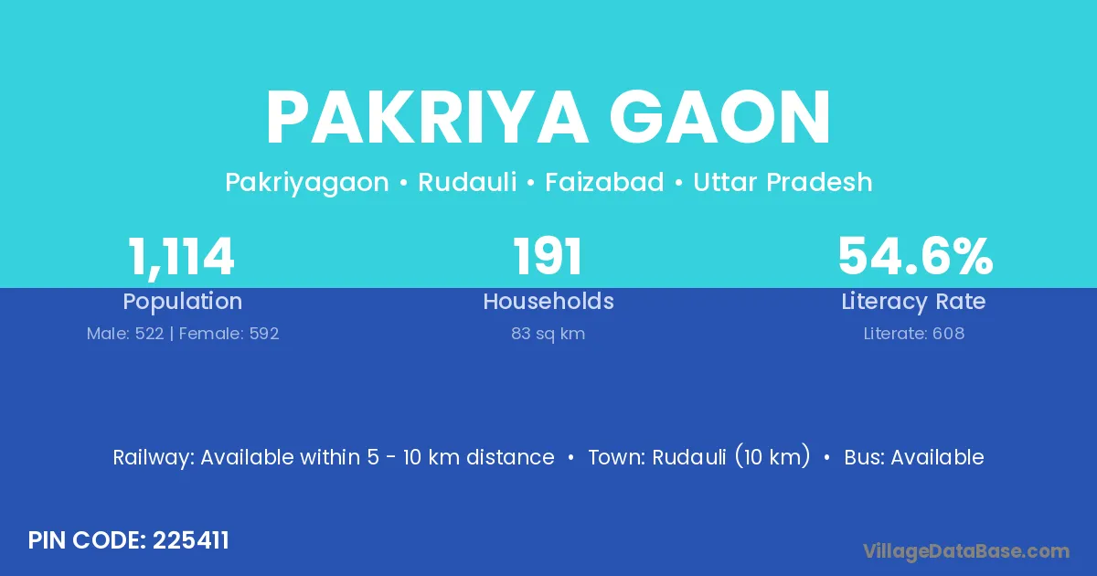 Rudauli (10 km) is the nearest town to Pakriya Gaon village for major economic activities and is located approximately 10 km away.