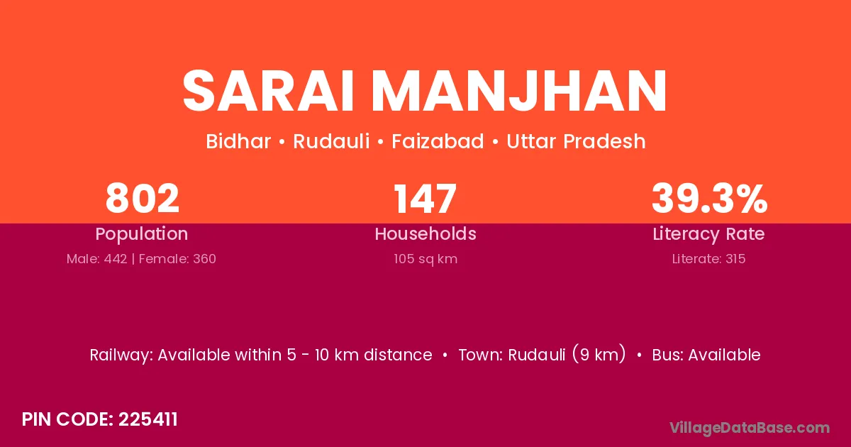 Rudauli (9 km) is the nearest town to Sarai Manjhan village for major economic activities and is located approximately 9 km away.