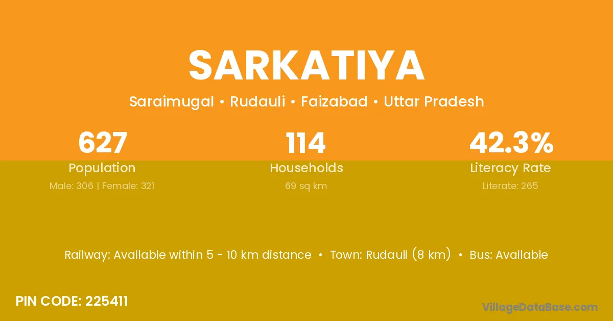 Sarkatiya village has a total population of 627 people, of which 306 are males and 321 are females.
