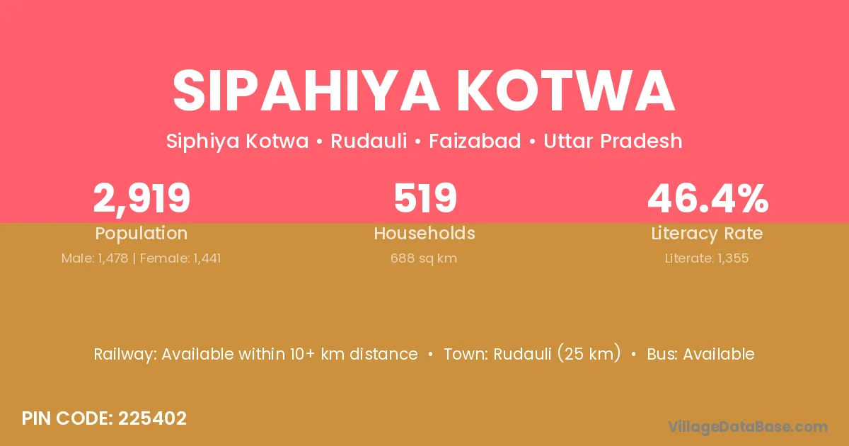 Sipahiya Kotwa village has a total population of 2,919 people, of which 1,478 are males and 1,441 are females.