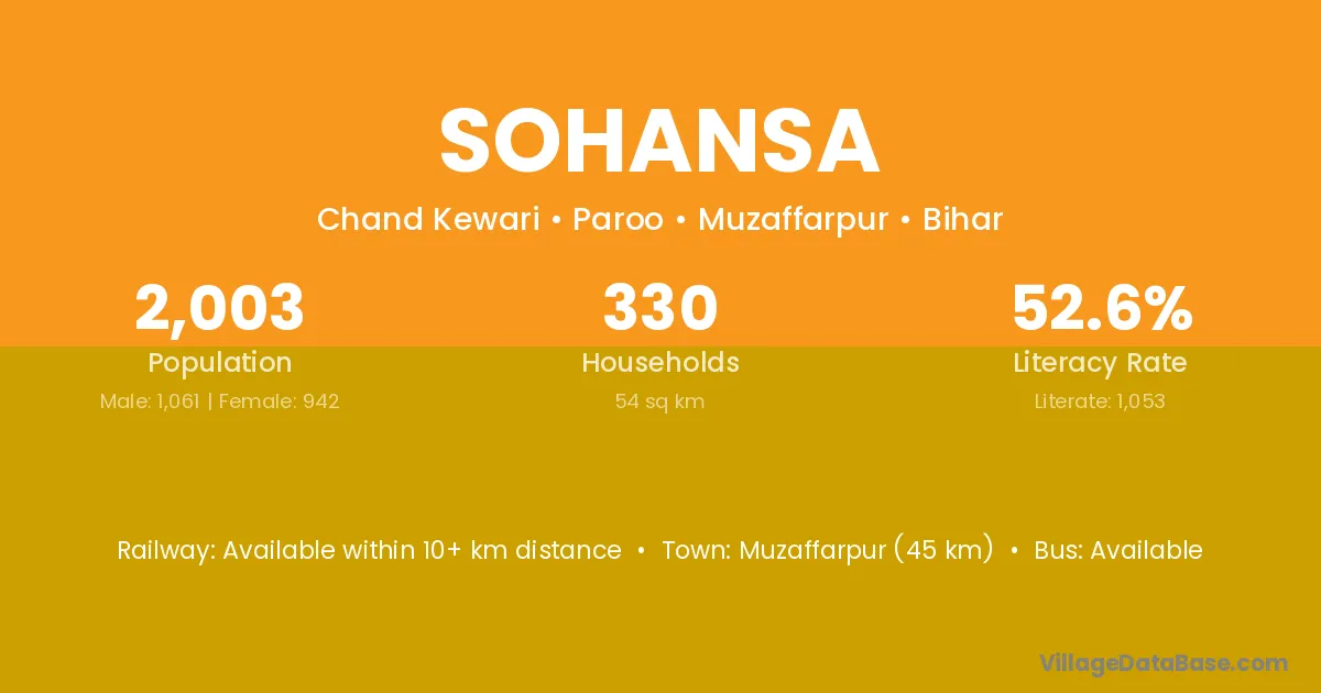 The literacy rate of Sohansa village is 37.14%. Male literacy stands at 48.00% and female literacy at 27.15%.