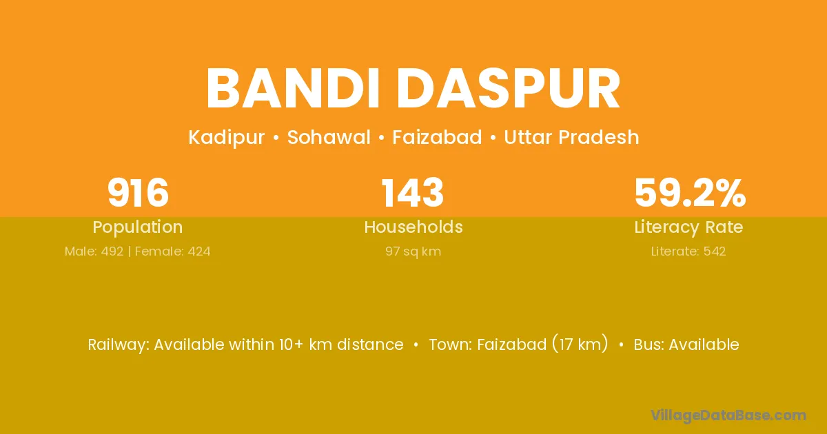 Faizabad (17 km) is the nearest town to Bandi Daspur village for major economic activities and is located approximately 17 km away.