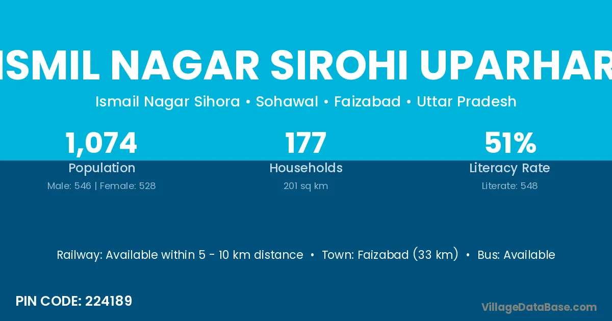 Faizabad (33 km) is the nearest town to Ismil Nagar Sirohi Uparhar village for major economic activities and is located approximately 33 km away.