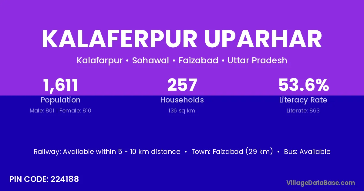 Faizabad (29 km) is the nearest town to Kalaferpur Uparhar village for major economic activities and is located approximately 29 km away.
