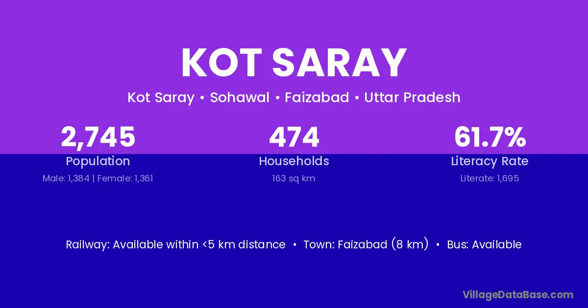 Faizabad (8 km) is the nearest town to Kot Saray village for major economic activities and is located approximately 8 km away.