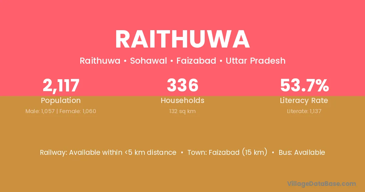Faizabad (15 km) is the nearest town to Raithuwa village for major economic activities and is located approximately 15 km away.