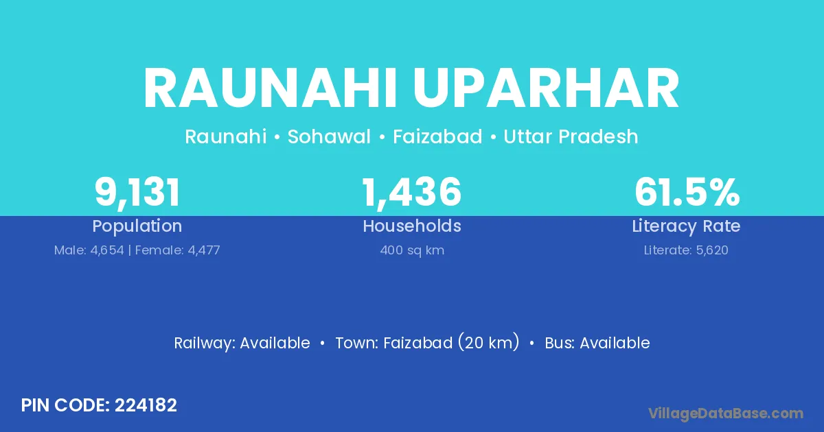 Faizabad (20 km) is the nearest town to Raunahi Uparhar village for major economic activities and is located approximately 20 km away.