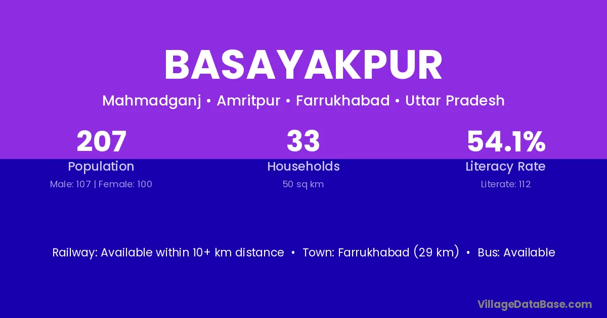 Farrukhabad (29 km) is the nearest town to Basayakpur village for major economic activities and is located approximately 29 km away.