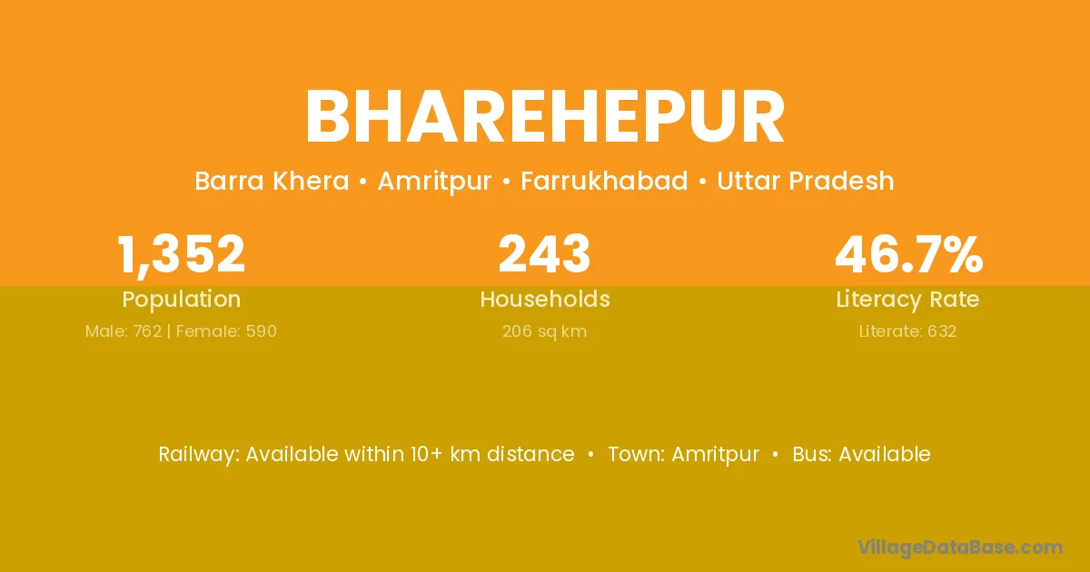 Bharehepur village has a total population of 1,352 people, of which 762 are males and 590 are females.