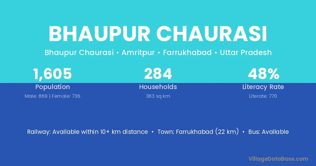 Farrukhabad (22 km) is the nearest town to Bhaupur Chaurasi village for major economic activities and is located approximately 22 km away.