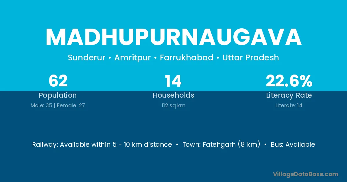Fatehgarh (8 km) is the nearest town to Madhupurnaugava village for major economic activities and is located approximately 8 km away.