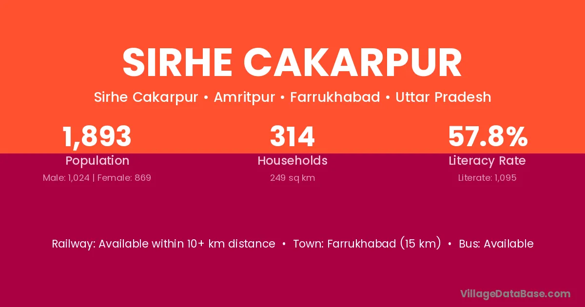 Sirhe Cakarpur village has a total population of 1,893 people, of which 1,024 are males and 869 are females.