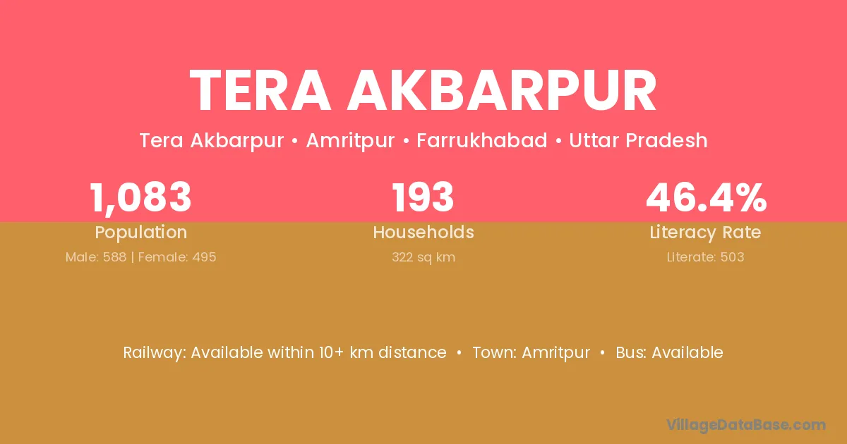 Tera Akbarpur village has a total population of 1,083 people, of which 588 are males and 495 are females.