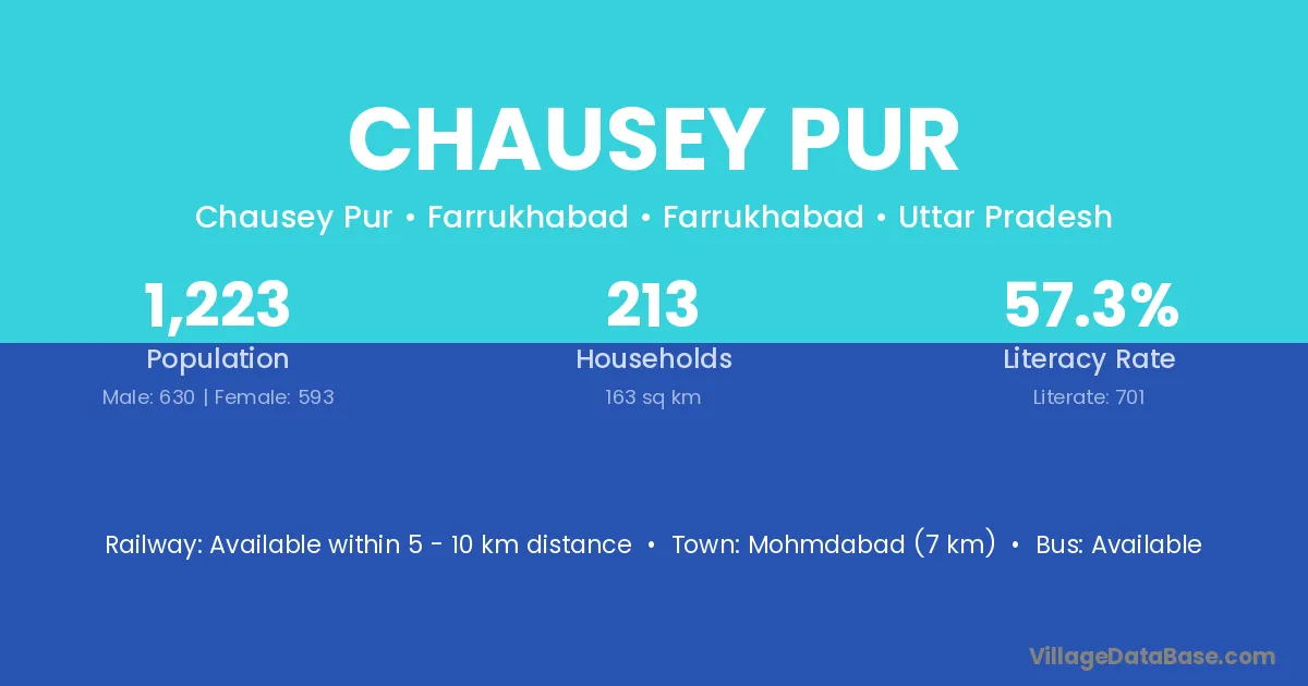 Chausey Pur village has a total population of 1,223 people, of which 630 are males and 593 are females.
