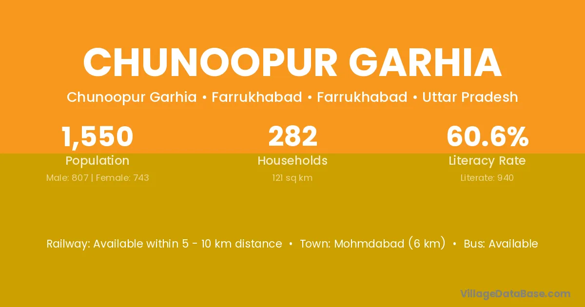Mohmdabad (6 km) is the nearest town to Chunoopur Garhia village for major economic activities and is located approximately 6 km away.