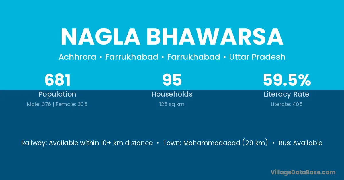 Mohammadabad (29 km) is the nearest town to Nagla Bhawarsa village for major economic activities and is located approximately 29 km away.