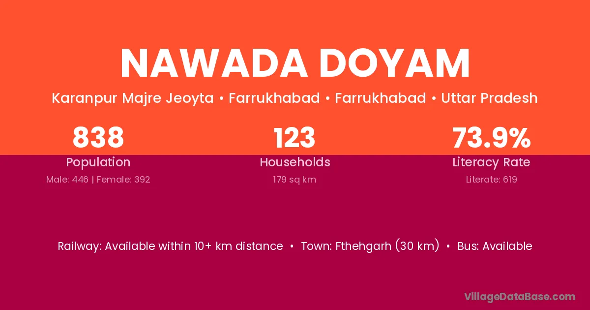 Fthehgarh (30 km) is the nearest town to Nawada Doyam village for major economic activities and is located approximately 30 km away.