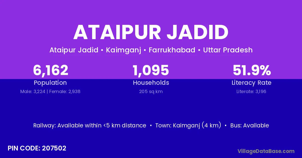 Kaimganj (4 km) is the nearest town to Ataipur Jadid village for major economic activities and is located approximately 4 km away.