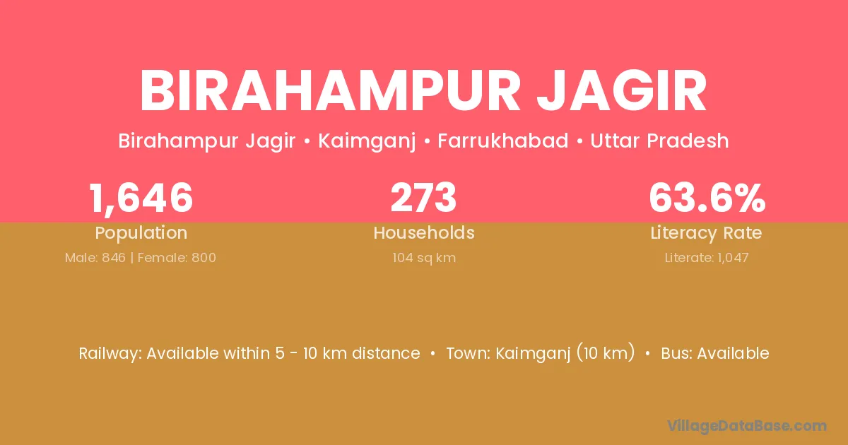 Kaimganj (10 km) is the nearest town to Birahampur Jagir village for major economic activities and is located approximately 10 km away.