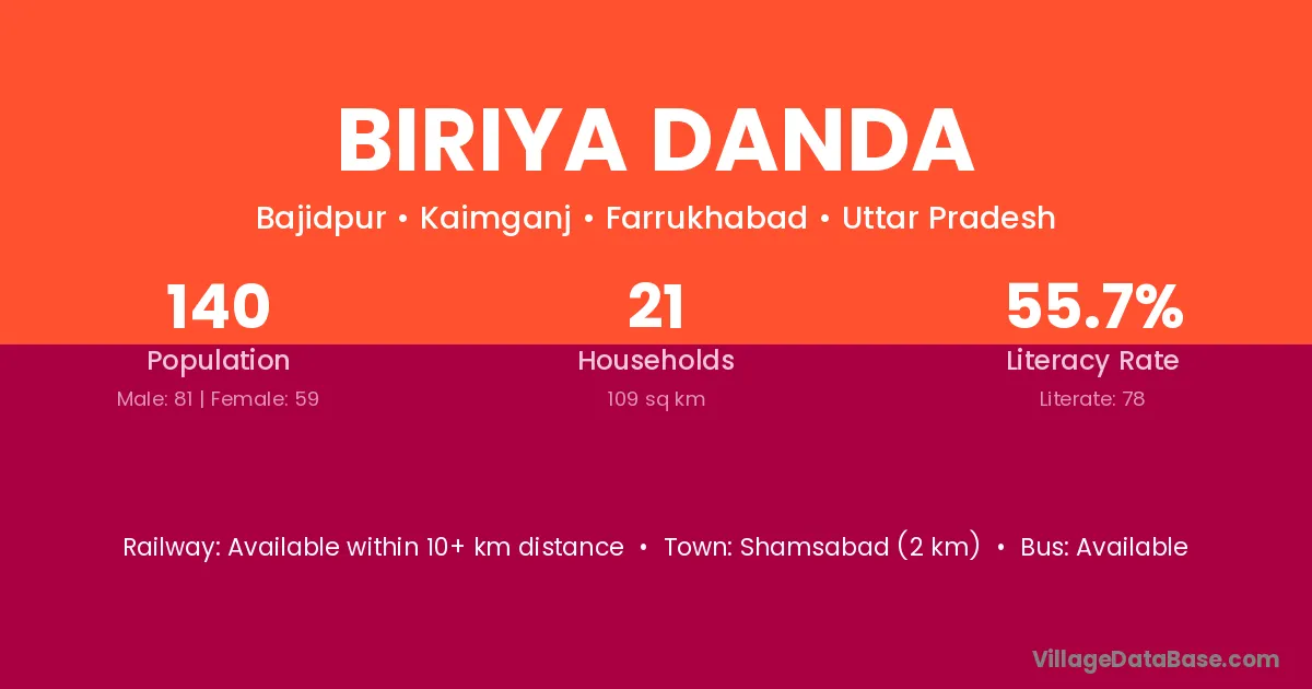 Shamsabad (2 km) is the nearest town to Biriya Danda village for major economic activities and is located approximately 2 km away.