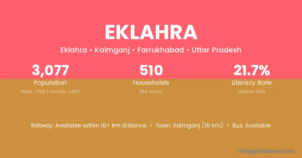 Kaimganj (15 km) is the nearest town to Eklahra village for major economic activities and is located approximately 15 km away.