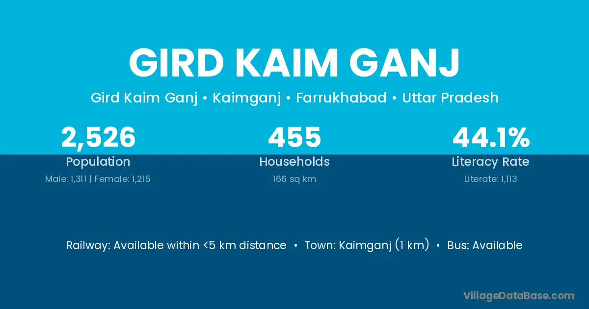 Kaimganj (1 km) is the nearest town to Gird Kaim Ganj village for major economic activities and is located approximately 1 km away.