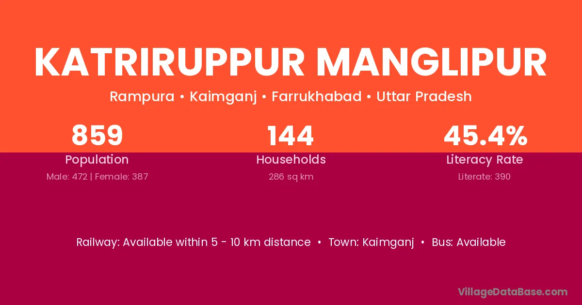 Katriruppur Manglipur village has a total population of 859 people, of which 472 are males and 387 are females.