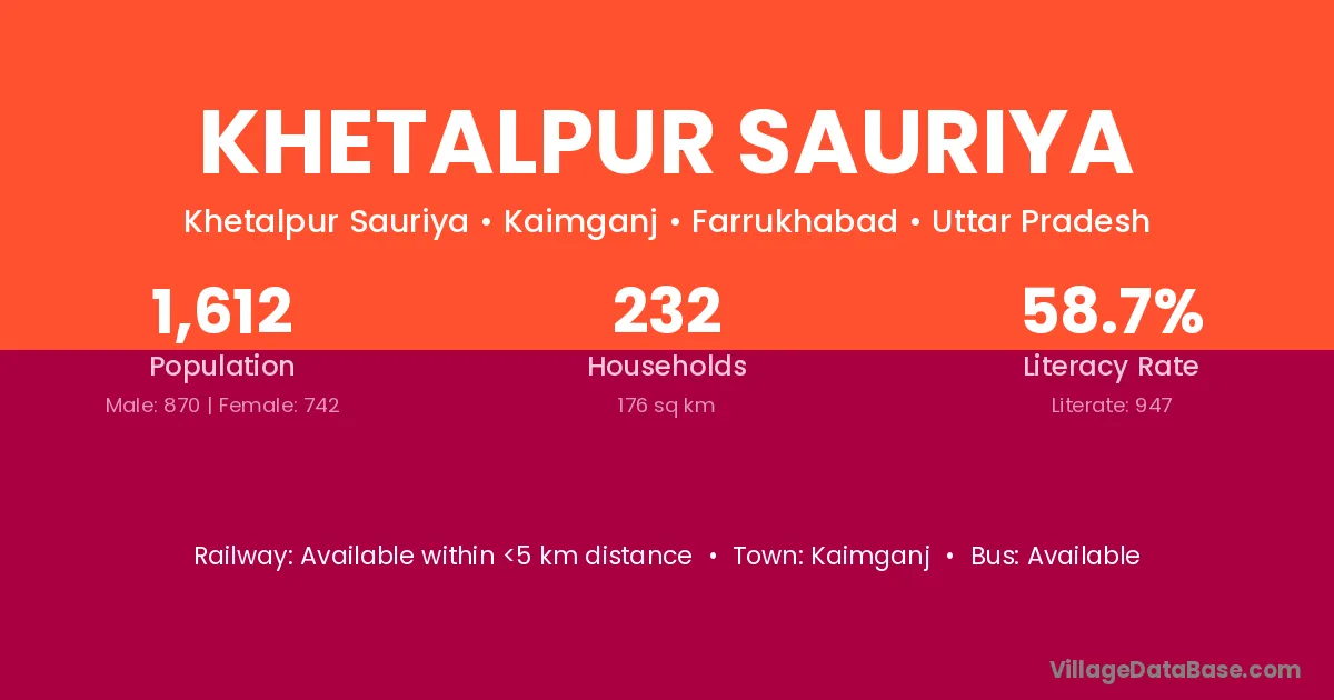 Khetalpur Sauriya village has a total population of 1,612 people, of which 870 are males and 742 are females.