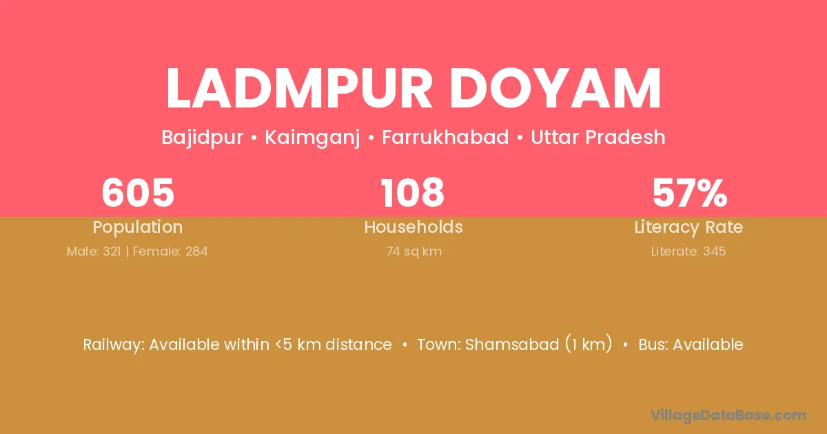 Shamsabad (1 km) is the nearest town to Ladmpur Doyam village for major economic activities and is located approximately 1 km away.