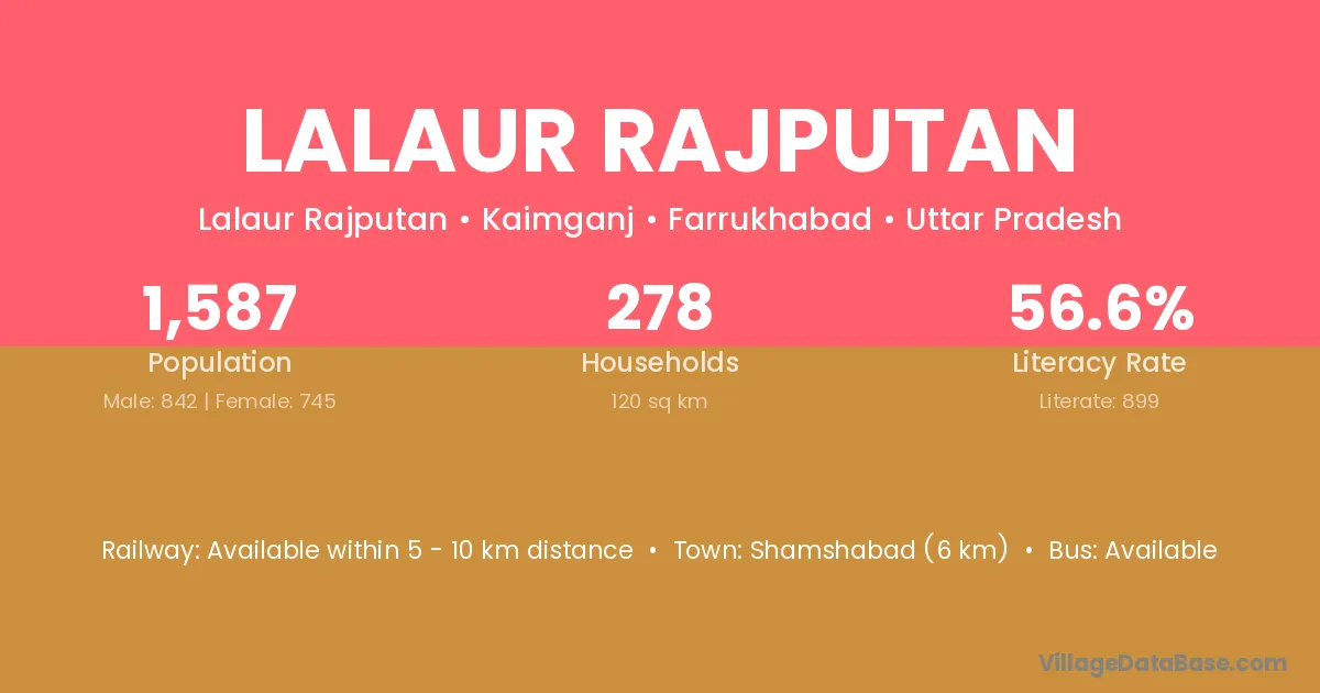 Shamshabad (6 km) is the nearest town to Lalaur Rajputan village for major economic activities and is located approximately 6 km away.
