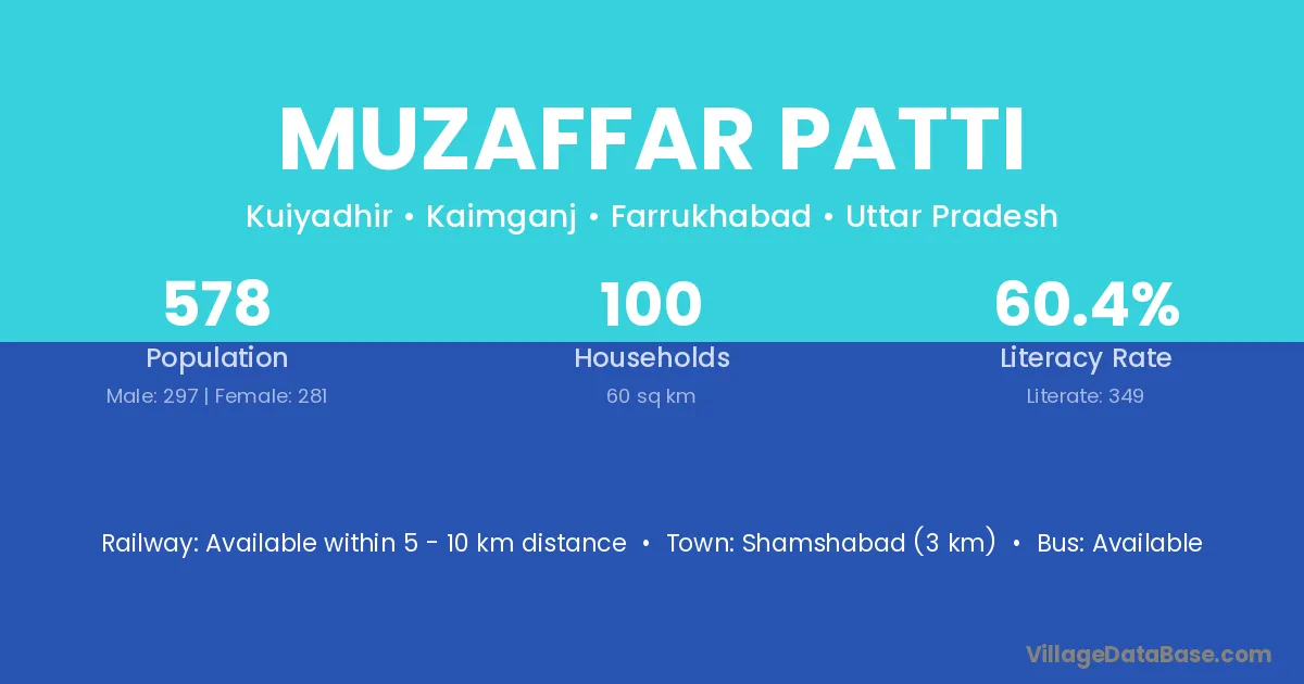 Shamshabad (3 km) is the nearest town to Muzaffar Patti village for major economic activities and is located approximately 3 km away.