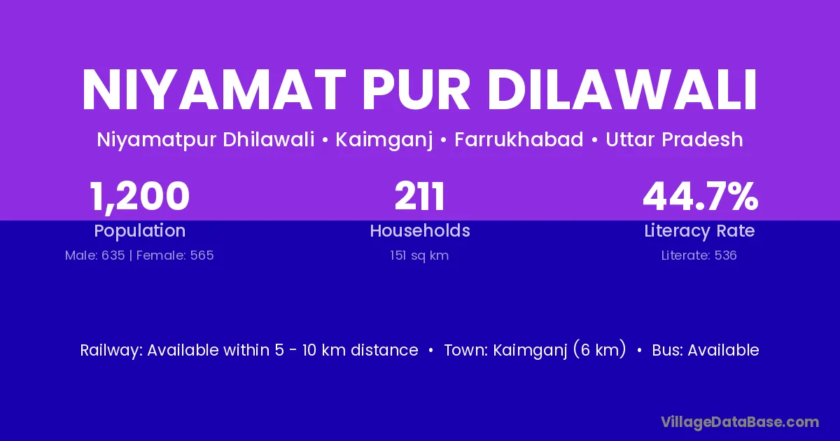 Niyamat Pur Dilawali village has a total population of 1,200 people, of which 635 are males and 565 are females.