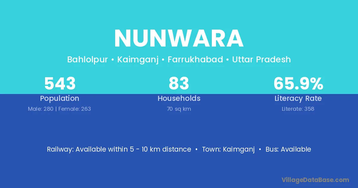 Nunwara village has a total population of 543 people, of which 280 are males and 263 are females.