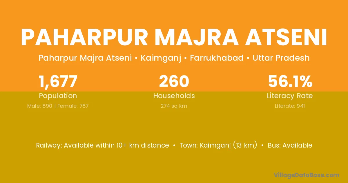 Kaimganj (13 km) is the nearest town to Paharpur Majra Atseni village for major economic activities and is located approximately 13 km away.