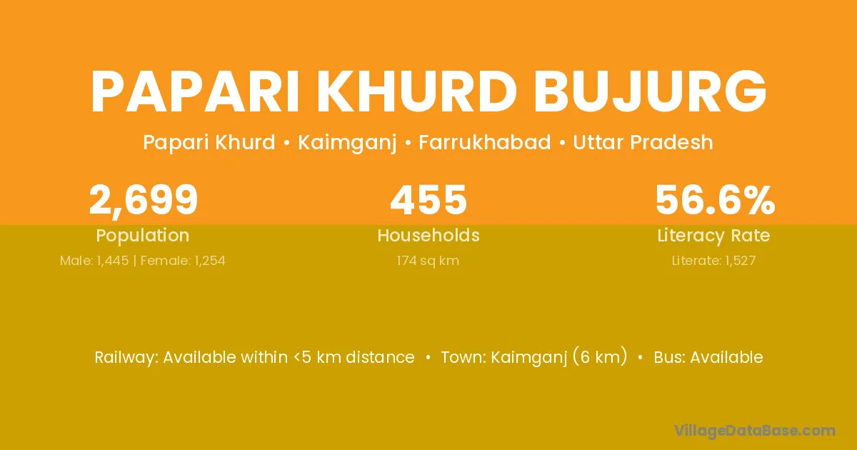 Kaimganj (6 km) is the nearest town to Papari Khurd Bujurg village for major economic activities and is located approximately 6 km away.