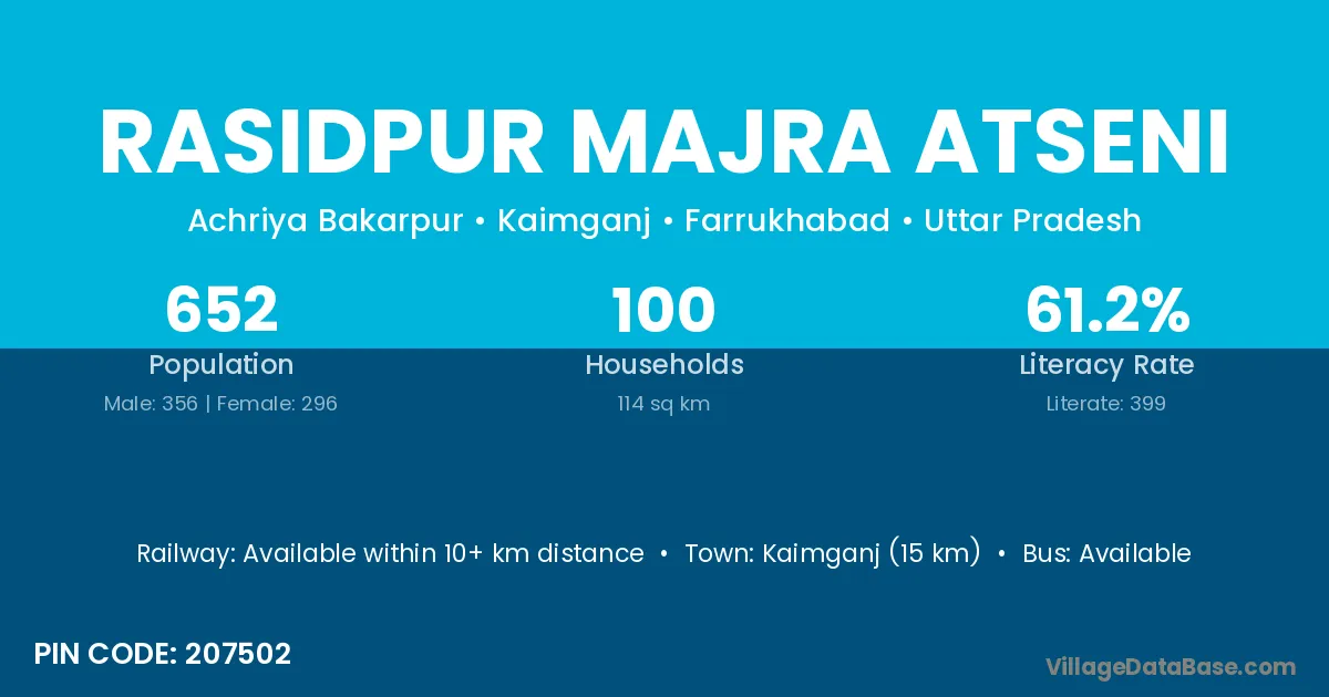 Kaimganj (15 km) is the nearest town to Rasidpur Majra Atseni village for major economic activities and is located approximately 15 km away.