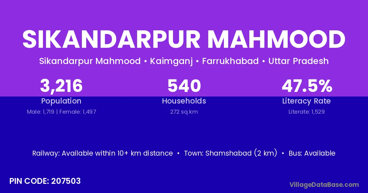 Shamshabad (2 km) is the nearest town to Sikandarpur Mahmood village for major economic activities and is located approximately 2 km away.