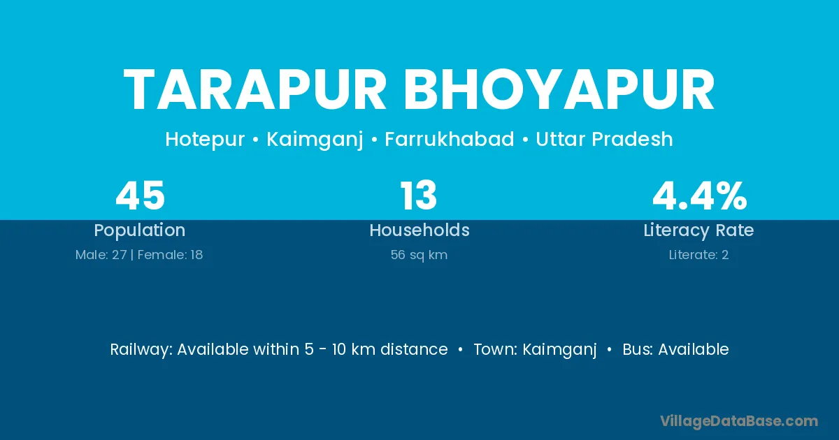 Tarapur Bhoyapur village has a total population of 45 people, of which 27 are males and 18 are females.