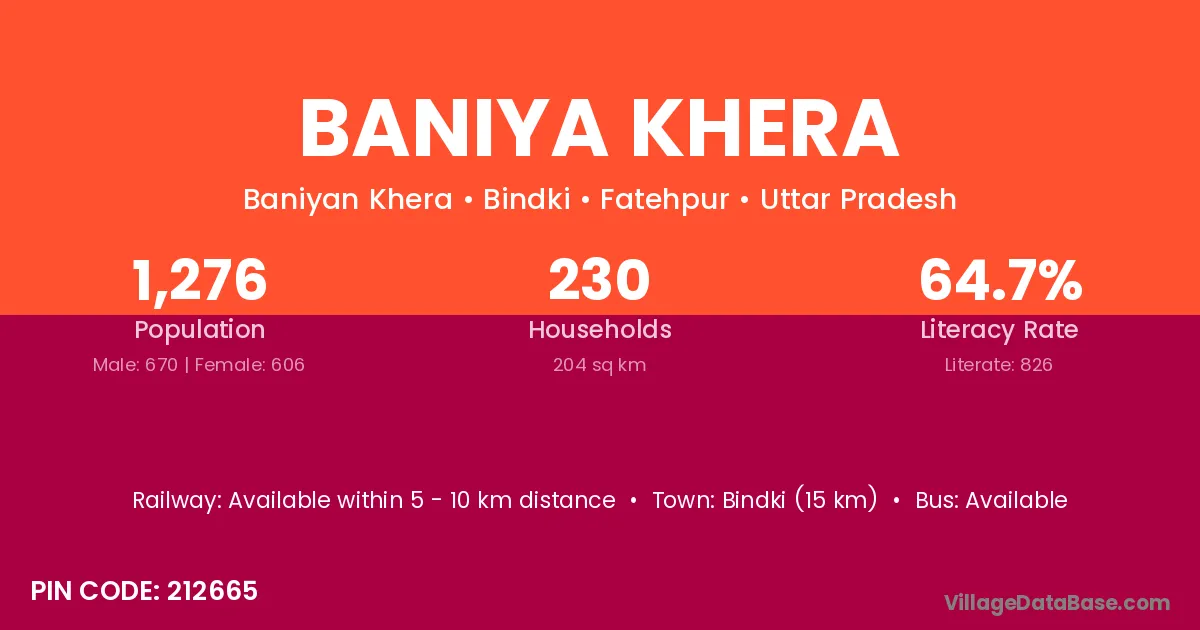 Bindki (15 km) is the nearest town to Baniya Khera village for major economic activities and is located approximately 15 km away.