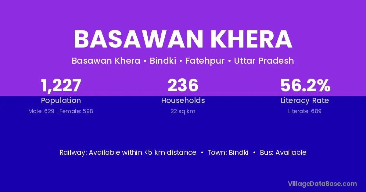Basawan Khera village has a total population of 1,227 people, of which 629 are males and 598 are females.
