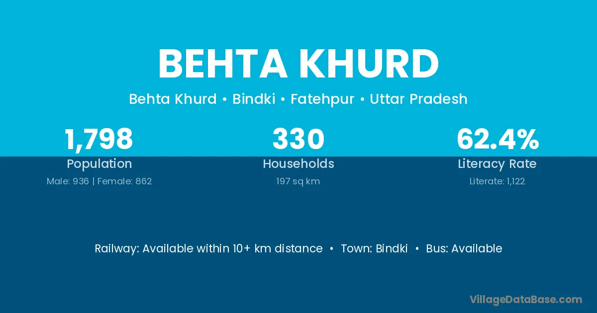 Behta Khurd village has a total population of 1,798 people, of which 936 are males and 862 are females.