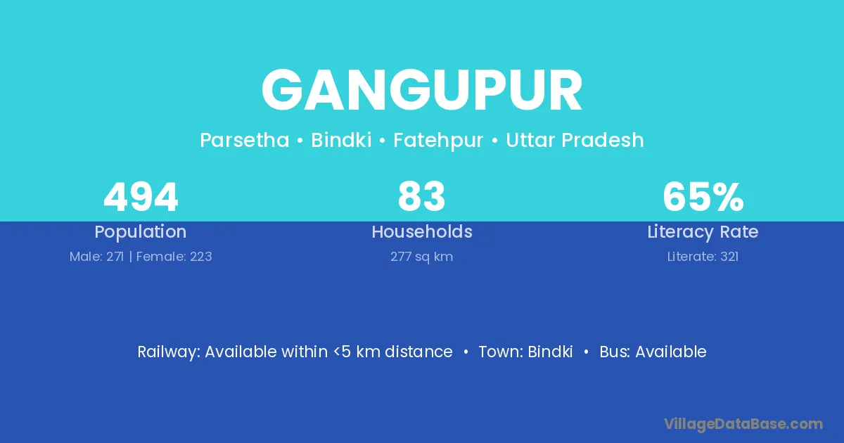 Gangupur village has a total population of 494 people, of which 271 are males and 223 are females.