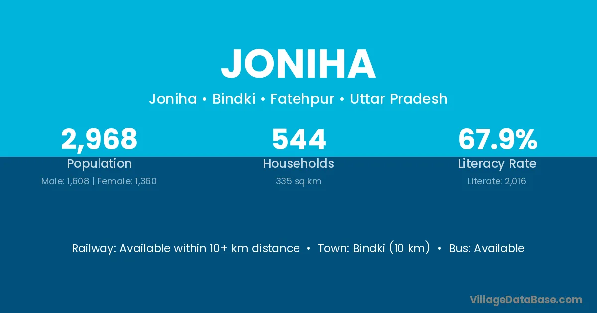 Bindki (10 km) is the nearest town to Joniha village for major economic activities and is located approximately 10 km away.