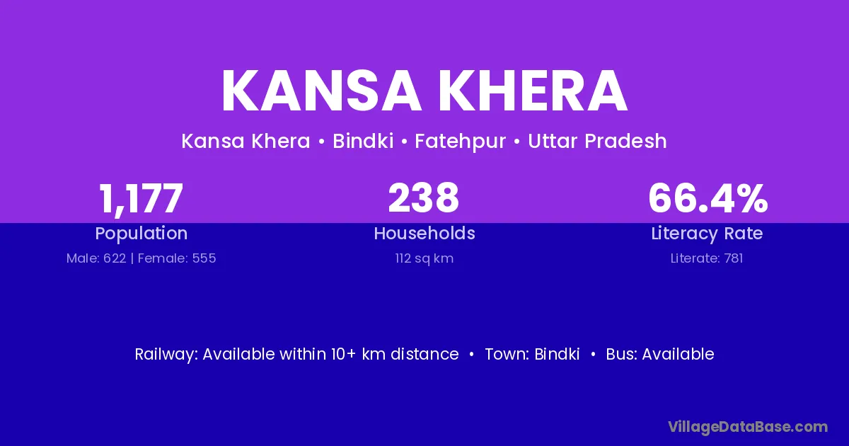 Kansa Khera village has a total population of 1,177 people, of which 622 are males and 555 are females.