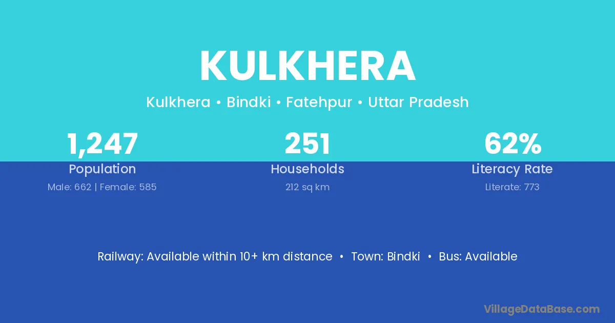 Kulkhera village has a total population of 1,247 people, of which 662 are males and 585 are females.