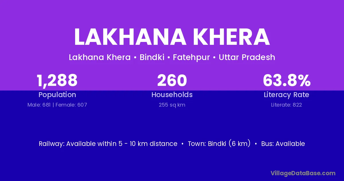 Bindki (6 km) is the nearest town to Lakhana Khera village for major economic activities and is located approximately 6 km away.