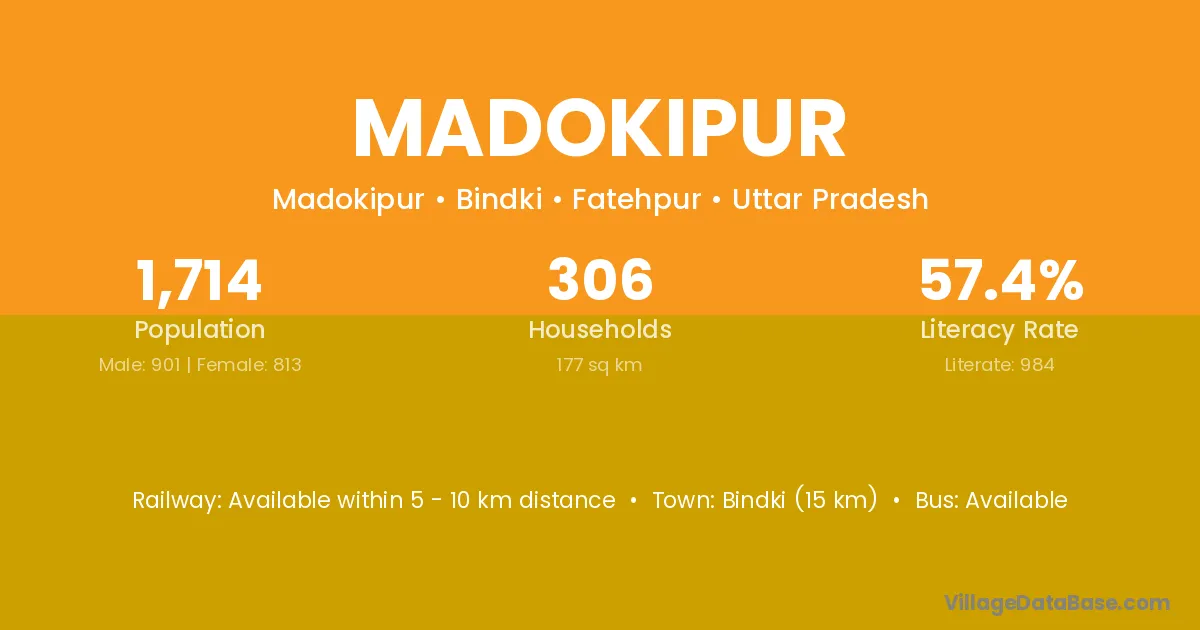 Bindki (15 km) is the nearest town to Madokipur village for major economic activities and is located approximately 15 km away.